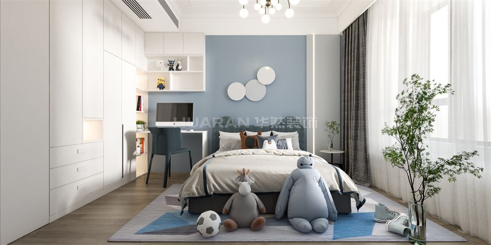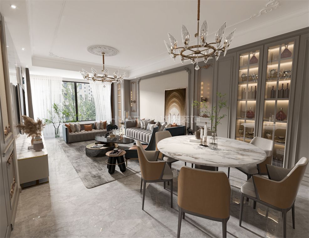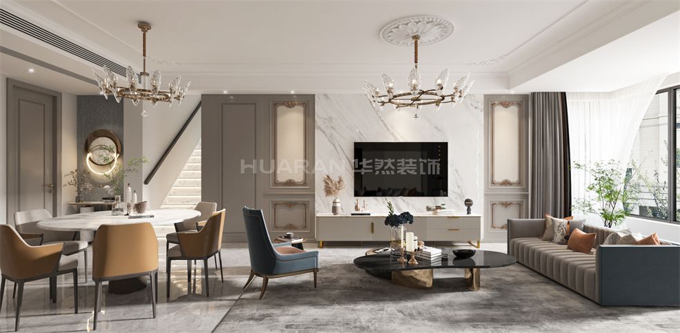 在整個空間用質樸的灰色調為視覺基礎,輔以深色的軟裝家具,低調而沉穩的空間氛圍呼之欲出,還帶著一種高級的質感。 耍客廳的沙發背景墻和電視背景墻利用石膏線條裝飾出畫框感,細膩的美式線條在空間里律動著,布局.上的對稱式設計,也更加規整有美感。